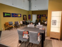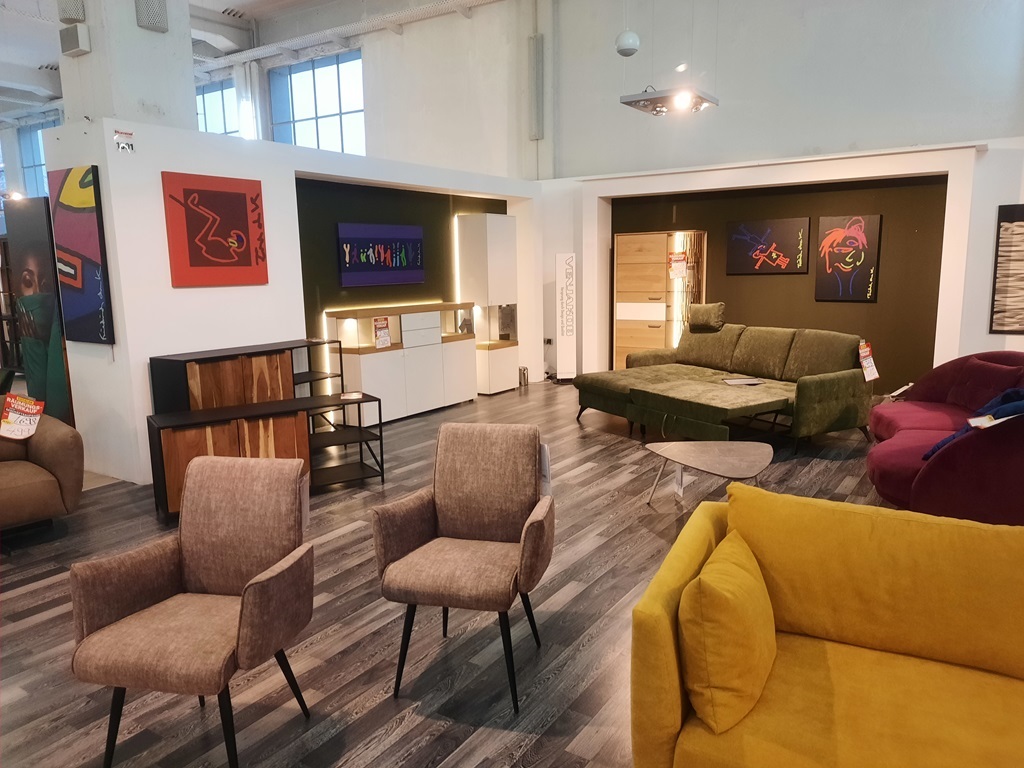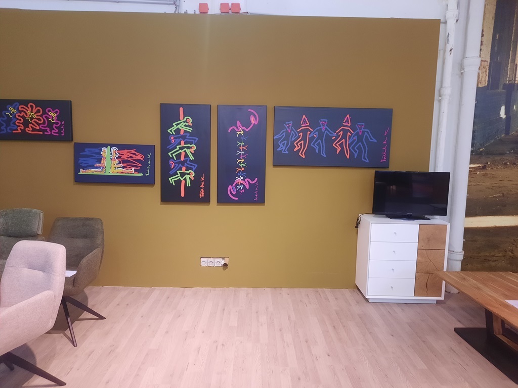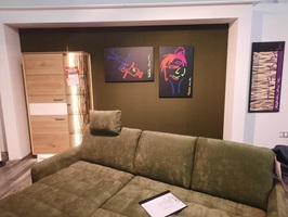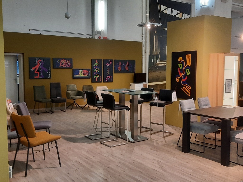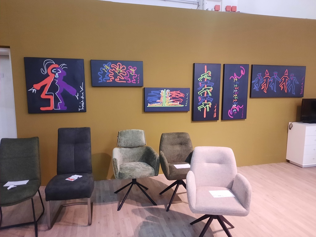 Seine farbintensiven Werke werden nicht nur ausgestellt – sie werden Teil der Räume. Zwischen Sofas, Tischen und Wohnlandschaften entfalten die Bilder ihre Wirkung und zeigen, wie Kunst und Einrichtung miteinander in Dialog treten können.